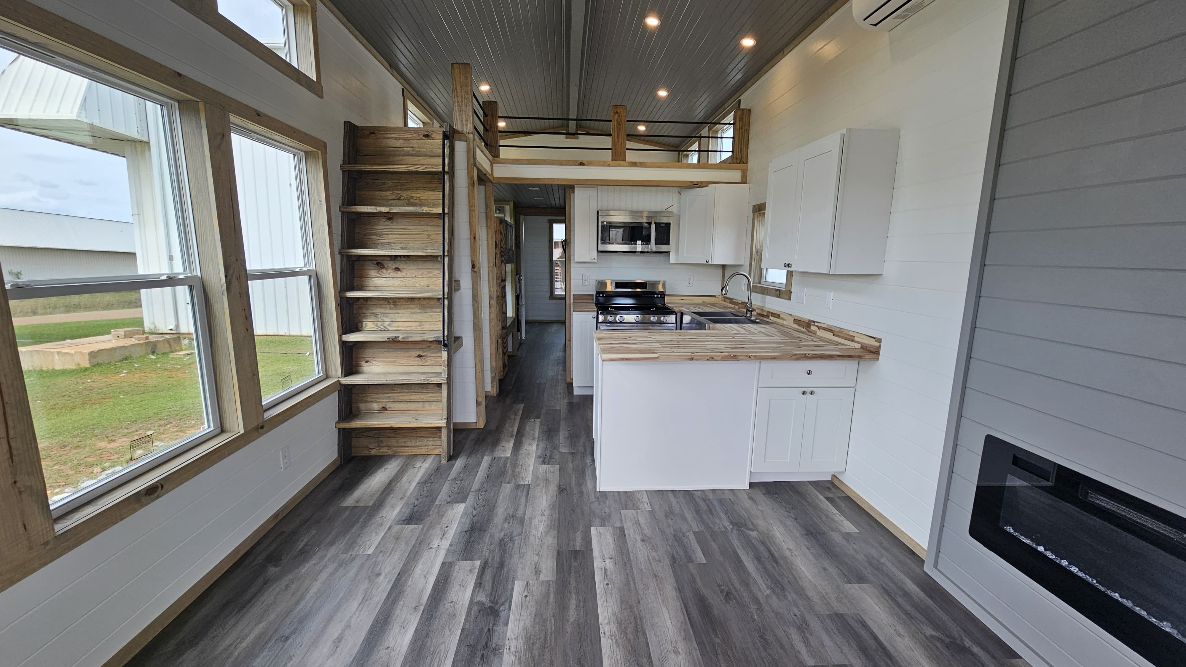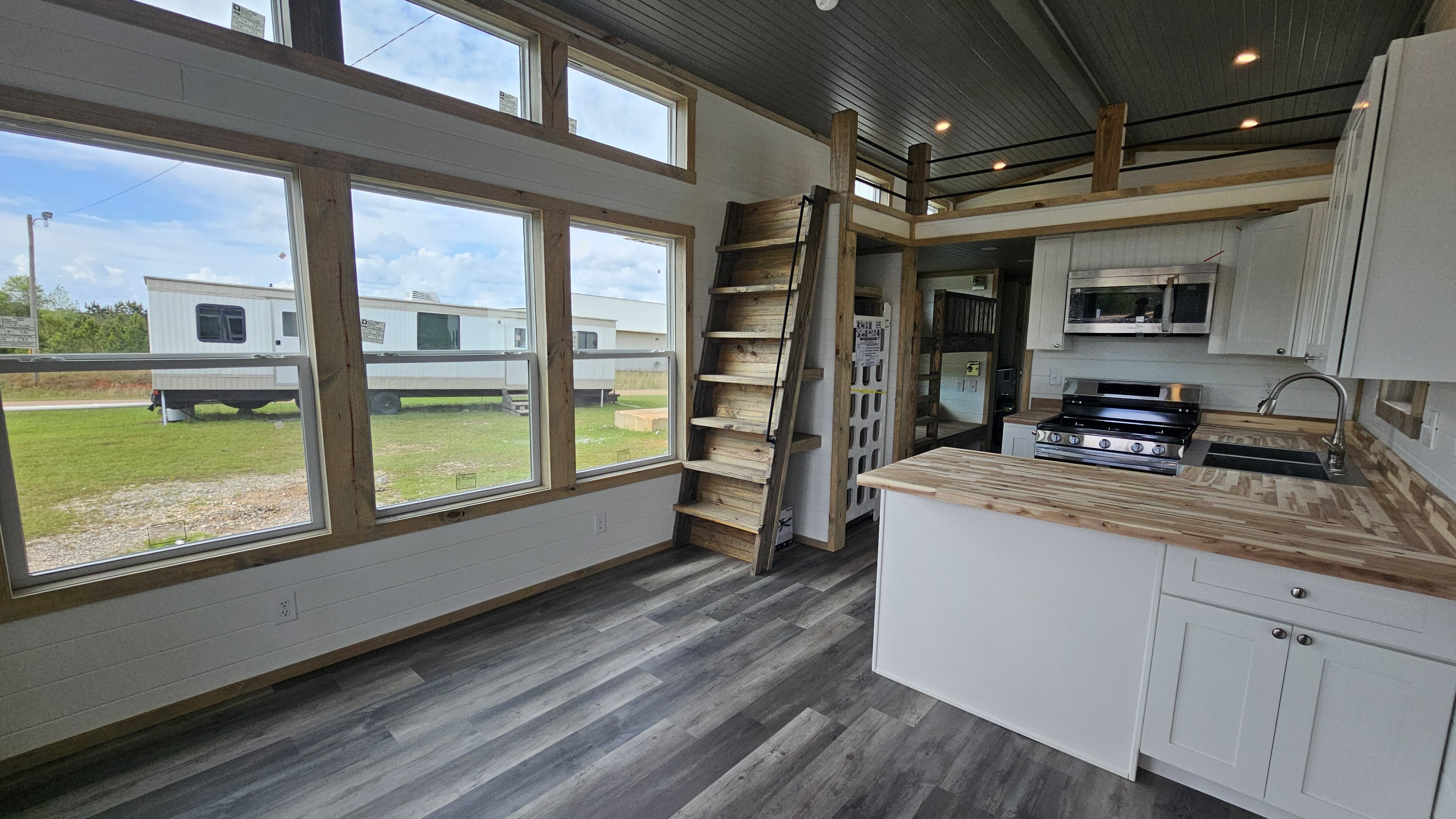 The Lodge is designed to maximize both comfort and character, combining a cozy cabin aesthetic with practical living solutions. The addition of a loft and built-in bunk expands sleeping capacity, making it ideal for families or rental use. Natural wood finishes throughout create warmth and texture, while the open layout keeps the space feeling bright, functional, and inviting.